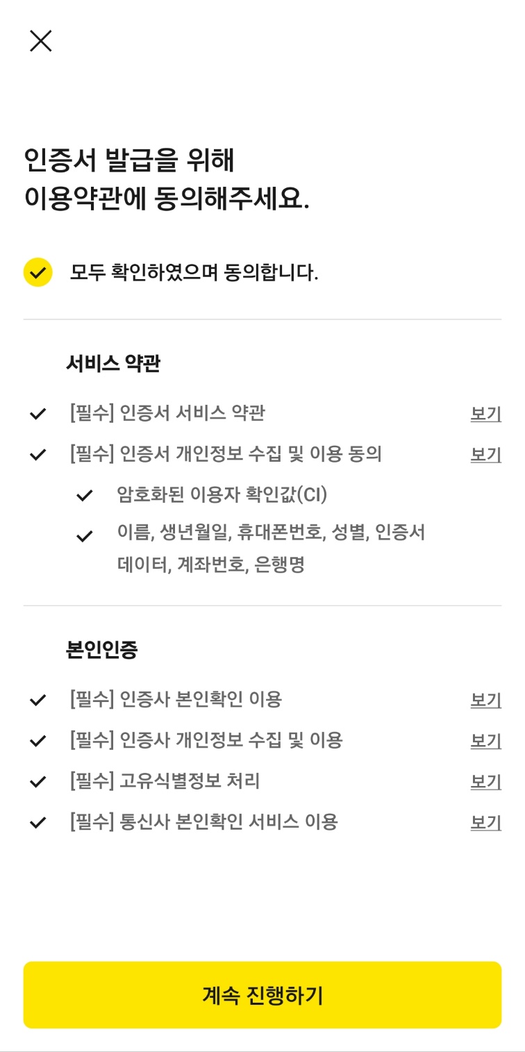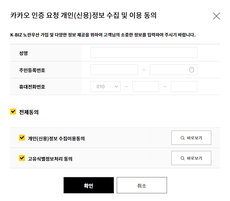 성명, 주민등록번호, 휴대전화번호를 적으시고, 전체동의 확인하시면 카카오톡으로 인증 메세지가 옵니다. 네이버는 네이버대로 각각의 앱에서 인증 메세지가 왔다면 완료시켜주세요.