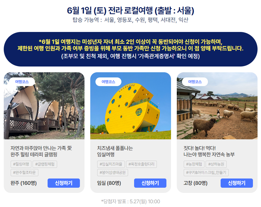 - 6월 1일 토요일 일정은 '부모 1~2인 및 미성년 자녀 2인 이상'으로 구성된 다자녀 가구만 신청할 수 있습니다.(조부모 및 친척제외) 당첨자에게는 가족관계증명 절차등을 통해 개별 안내를 드릴 예정입니다.