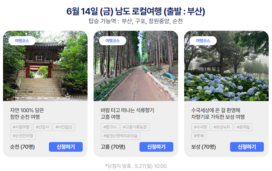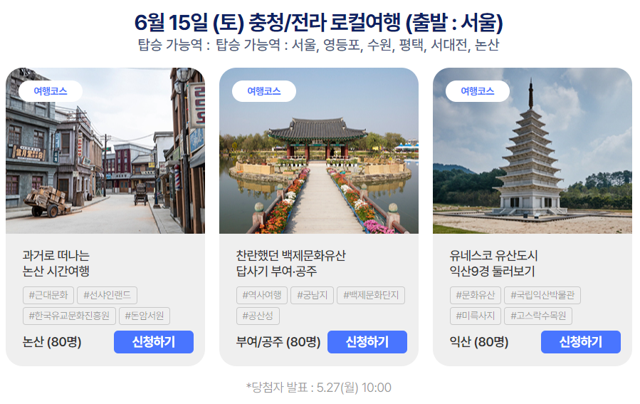 - 전체 일정 중, 1개 코스에만 신청 가능합니다. (※ 중복 당첨은 불가하며, 동반인도 신청된 것으로 인정합니다.)